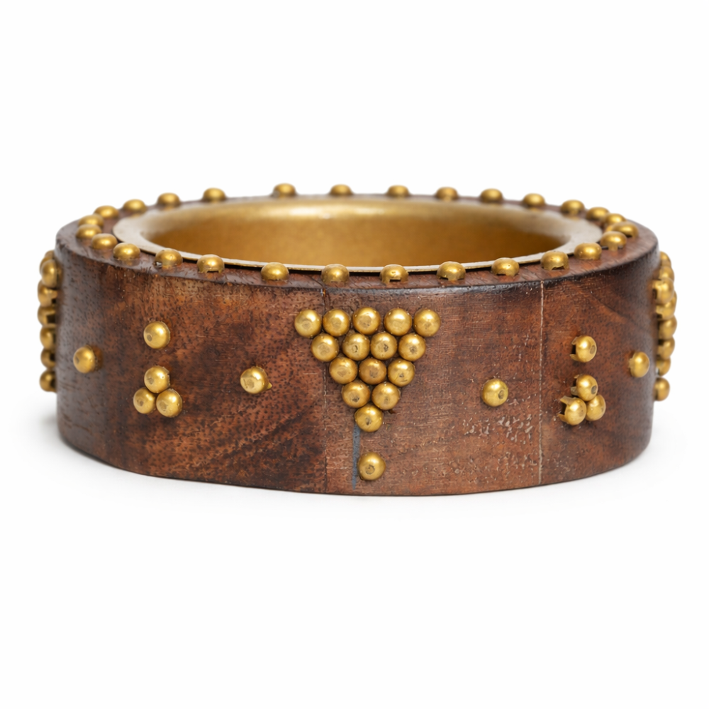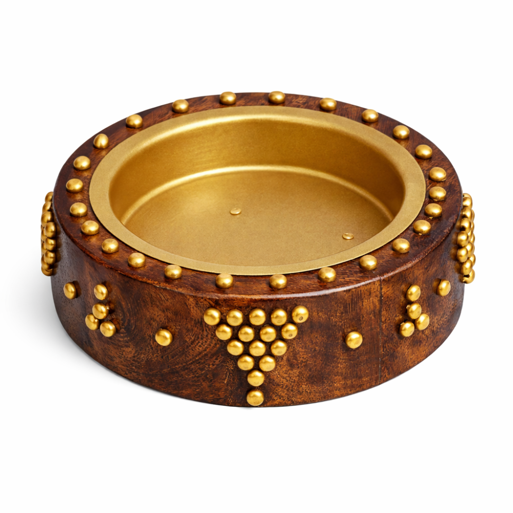 مبخرة نجد الدائرية شغل يدوي، مصنوعة من الخشب الطبيعي بتطعيمات نحاسية ذهبية وتصميم تراثي بسيط وأنيق. تتميز بوعاء داخلي مقاوم للحرارة، مثالية لتبخير العود والبخور وتضيف لمسة أصالة للمجالس